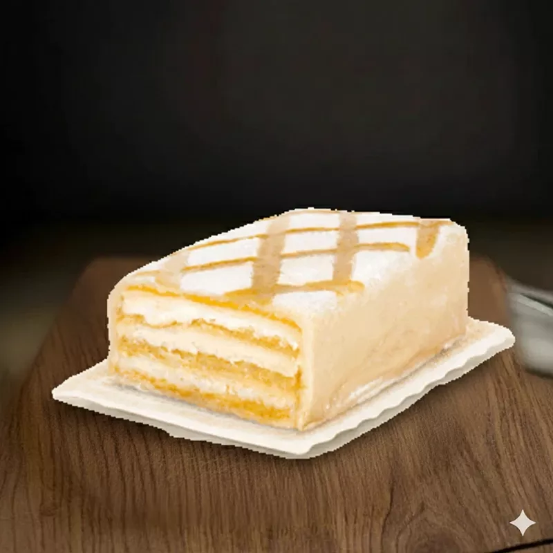 Tarta de finas capas de bizcocho con crema pastelera, yema de huevo y una fina cobertura de mazapán.